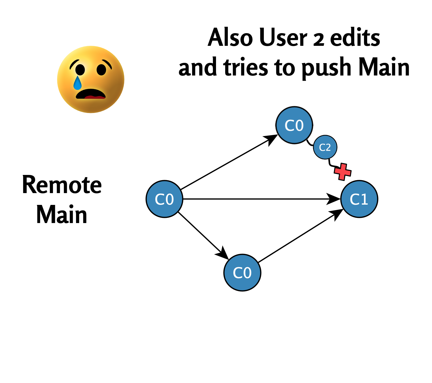 C2. - User 2 tries to execute a push command, but Git prevents this because the main branch in the remote repository has advanced to commit state